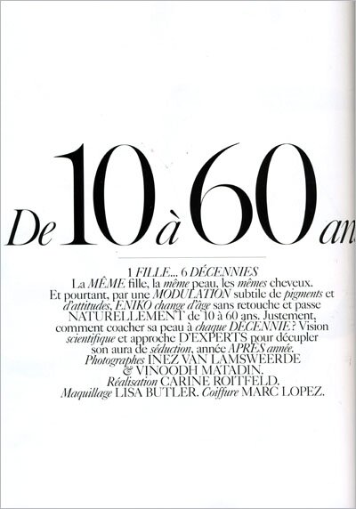 “Vogue Paris November 2008 with Eniko Mihalik by Inez van Lamsweerde and Vinoodh Matadin styled by Carine Roitfeld, make-up by Lisa Butler.”