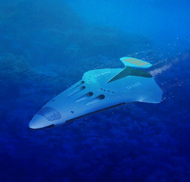 Underwater gliders work by being buoyantly nearly neutral while near the water’s surface, so that they sink slowly down. Very slowly – full steam ahead is under one knot. As they sink, an internal weight is shifted toward the lateral direction the vehicle should go – if you want to go straight, just shift the weight forward to tilt the nose down a bit. Then to rise, pump an oil contained inside the hull into external sacks – this simple maneuver increases the craft’s volume, and thus lowers its density just enough that now the surrounding water wants to push it upward.